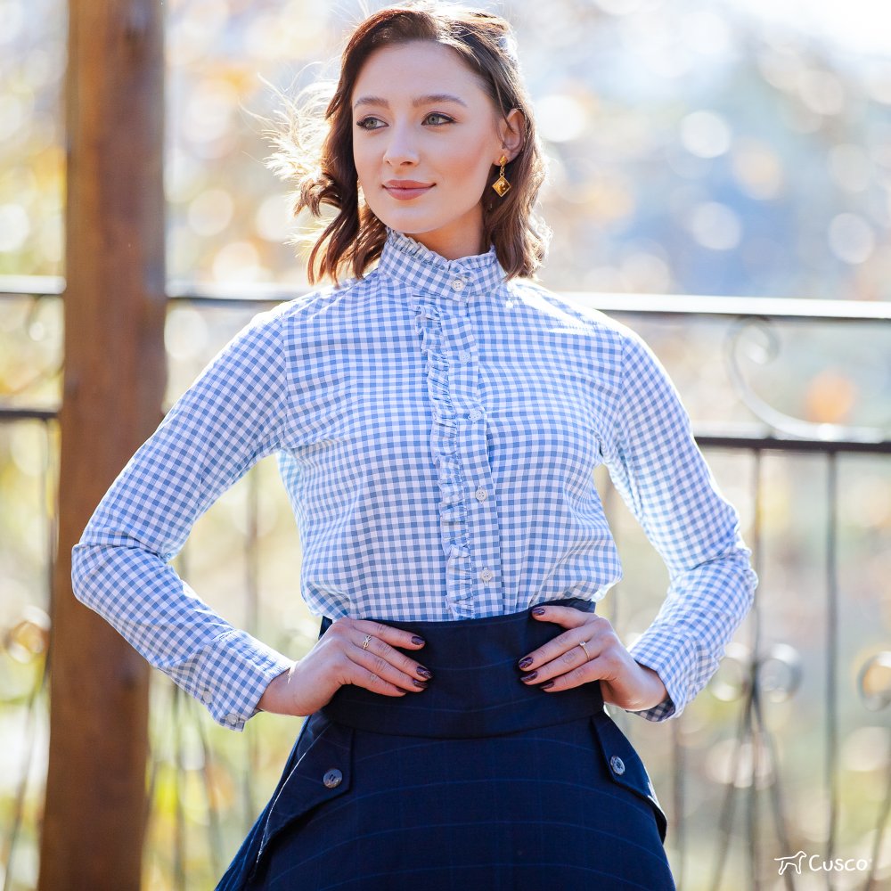 O destaque da peça está na gola padre com detalhe em babado, que traz charme e romantismo ao design, aliado ao fechamento frontal por botões forrados, que completam o toque clássico da blusa. O padrão xadrez delicado realça a feminilidade e proporciona versatilidade, podendo ser combinada facilmente com bombachas, saias ou calças, tanto para momentos campeiros quanto para o uso urbano.