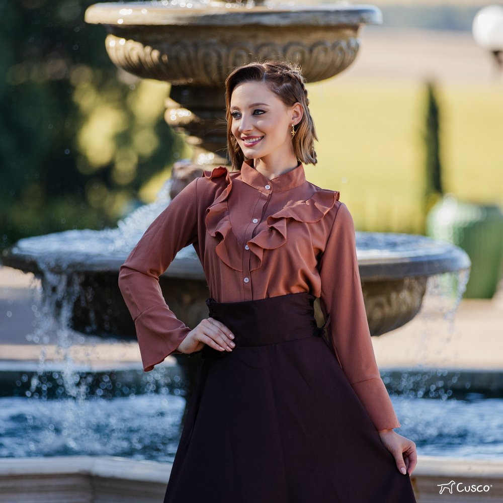 Camisa Cusco Crepe Mustang com Babado na Frente e nas Mangas