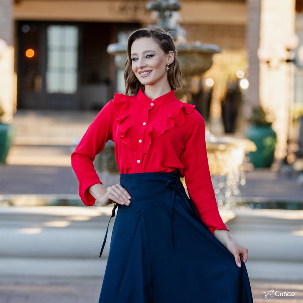 Seu grande destaque está nos babados na parte frontal e nas mangas, que trazem um toque romântico e refinado, valorizando a feminilidade e garantindo presença marcante no visual. A modelagem é pensada para oferecer ótimo ajuste ao corpo, sem perder a leveza e liberdade de movimento.