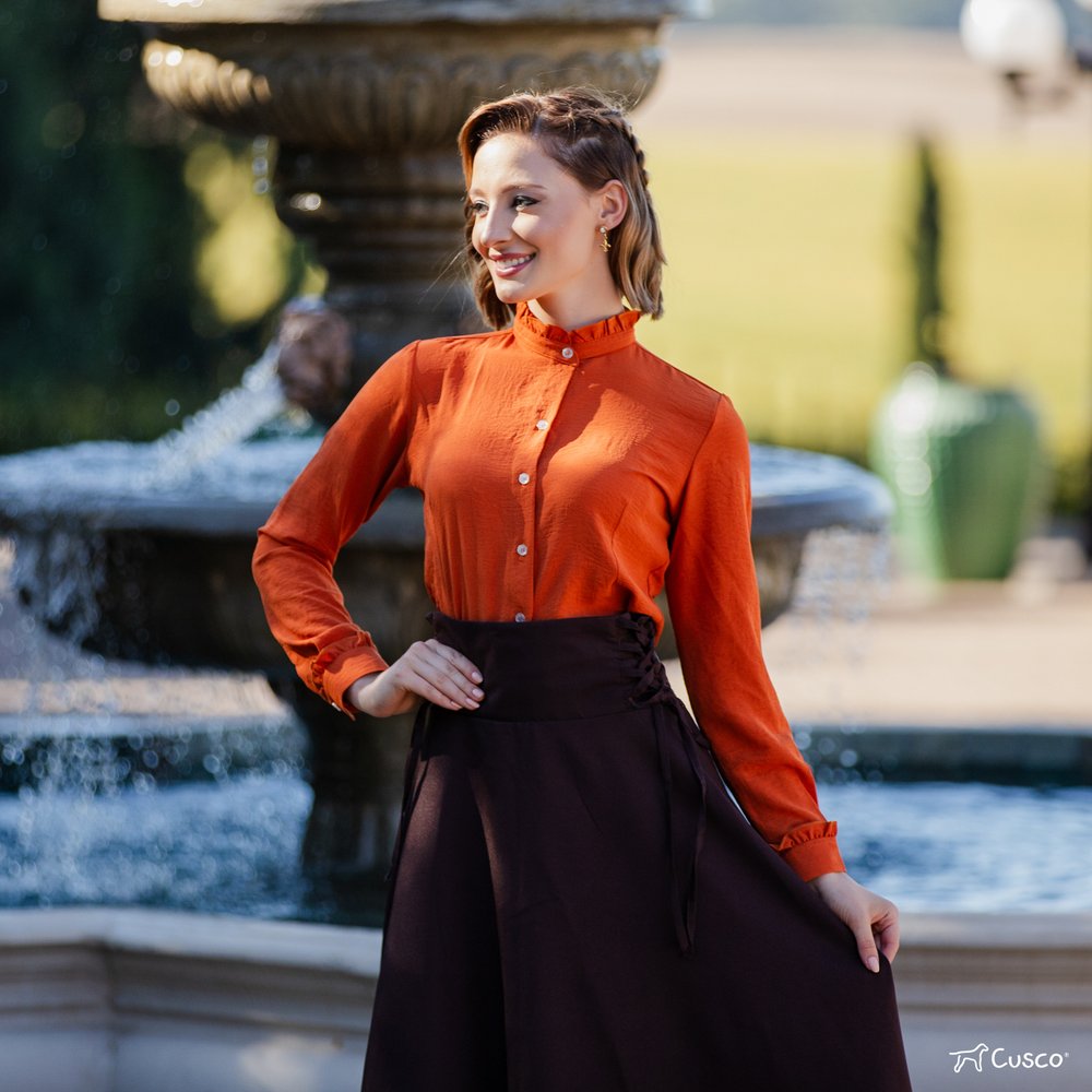 O destaque está na gola e punhos franzidos, que adicionam charme e sofisticação ao design clássico da camisa. O fechamento frontal por botões traz praticidade, enquanto a modelagem atemporal garante versatilidade para diferentes combinações – seja com bombachas, saias ou calças, no campo ou na cidade.