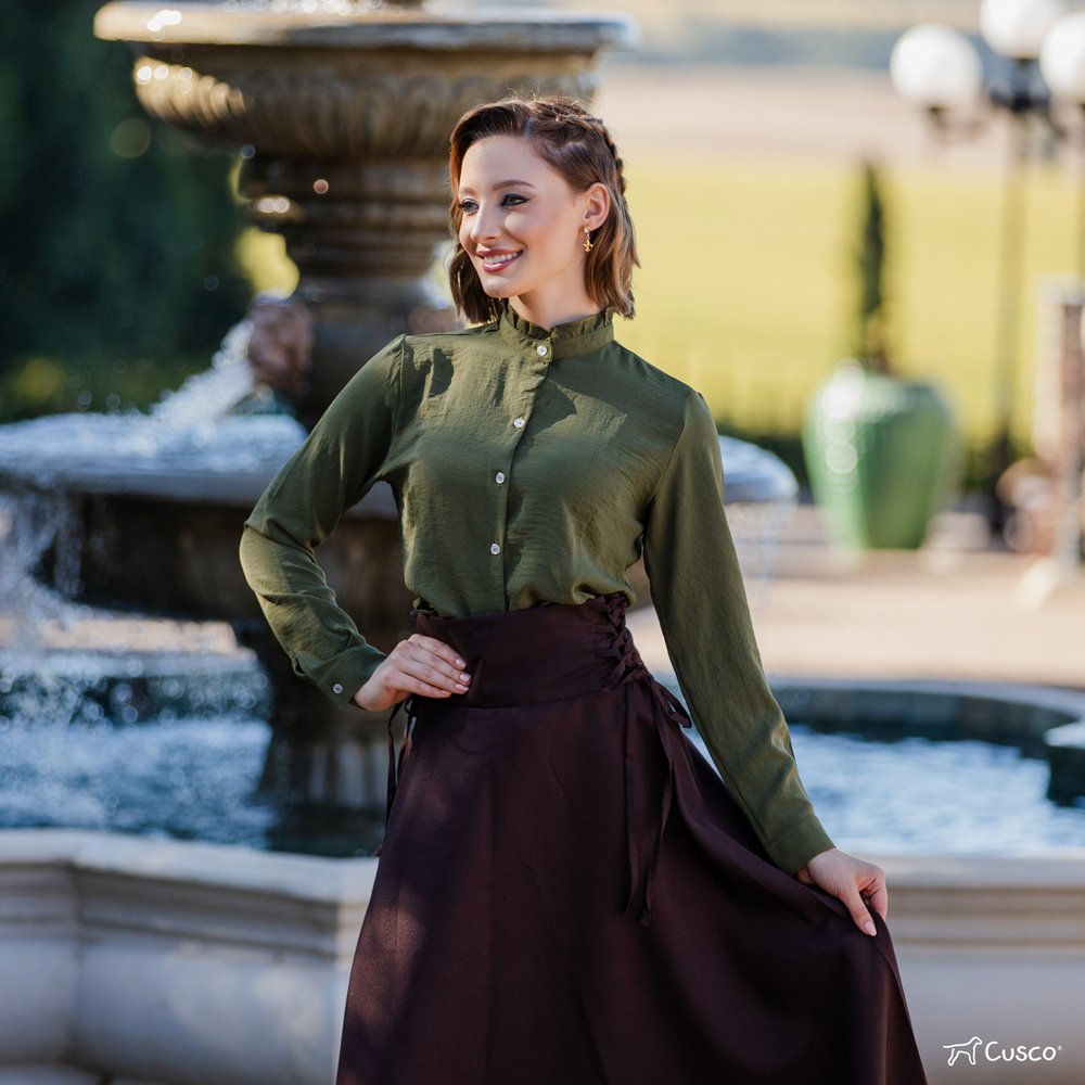 O destaque está na gola e punhos franzidos, que adicionam charme e sofisticação ao design clássico da camisa. O fechamento frontal por botões traz praticidade, enquanto a modelagem atemporal garante versatilidade para diferentes combinações – seja com bombachas, saias ou calças, no campo ou na cidade.